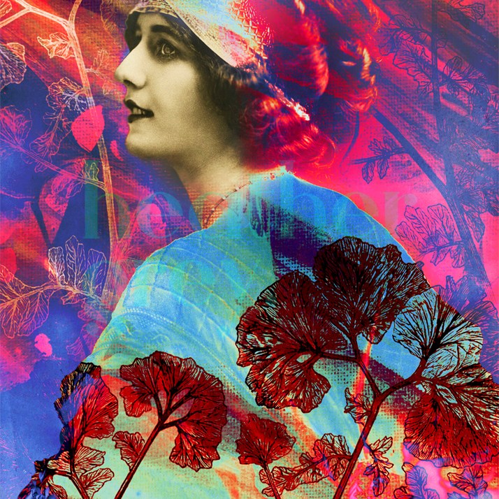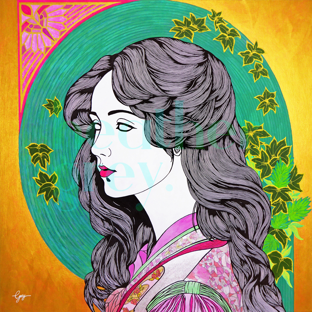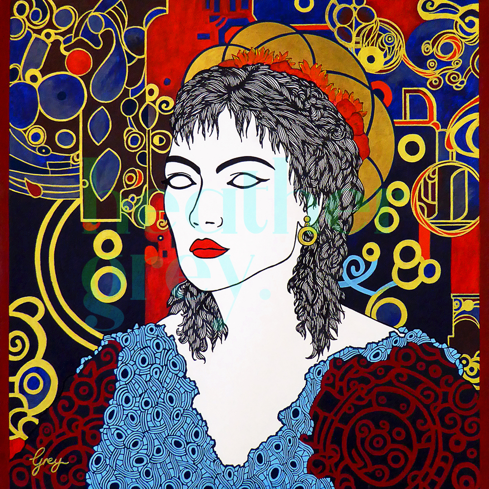 An acrylic painter and collage artist from Durham, Heather Grey’s eye-catching portraits of historical goddesses and screen ‘idols’ are imbued with jewel-like colour palettes and rich metallic gold details.